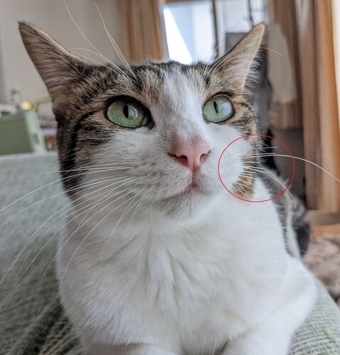 マロンの顔を見たときに違和感があったのだが、よく見ると、いやよく見なくても左のヒゲがない?切れてる? 右と比べると数本残してスパッと切れちゃってる。 キリッ!ヒゲがないですよ!? ヒゲがなくなると、とか昔見た気がするが、元気にしてるし問題ない…